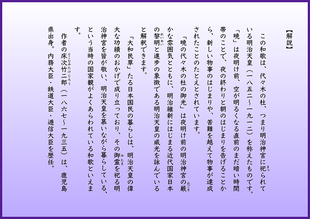 作品や作者の紹介、時代背景等、分かる範囲で解説をします。 |